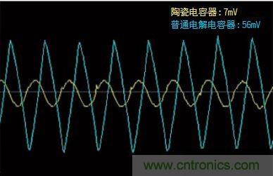 其優(yōu)點主要有兩個。一是能削減貼裝面積。因為片狀多層陶瓷電容器單位體積的靜電容量較大。另一個是用于DC-DC轉(zhuǎn)換器等輸出平滑電路時,可降低輸出紋波電壓。原因在于片狀多層陶瓷電容器的等效串聯(lián)電阻(ESR:Equivalent Series Resistance)較低。如圖1所示,使用鉭電解電容器時,輸出紋波電壓為56mV,而使用片狀多層陶瓷電容器時則降到了7mV。
