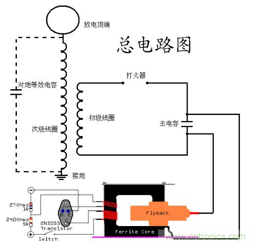 SGTC的原理就是先給電容充電,電容的電壓達(dá)到一定程度時(shí),在打火器出放出電弧,形成一個(gè)回路,然后放電,之后重新開始這個(gè)循環(huán)。