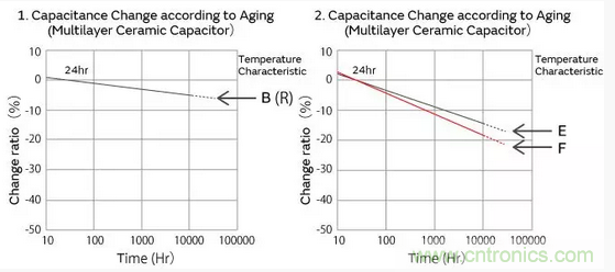 高誘電系的積層陶瓷電容器的靜電容量,以經(jīng)過125℃以上的熱處理24小時后的值作為基準,與時間成對數(shù)關(guān)系直線性下降。請參考如下本公司制品靜電容量老化特性的代表例子。
