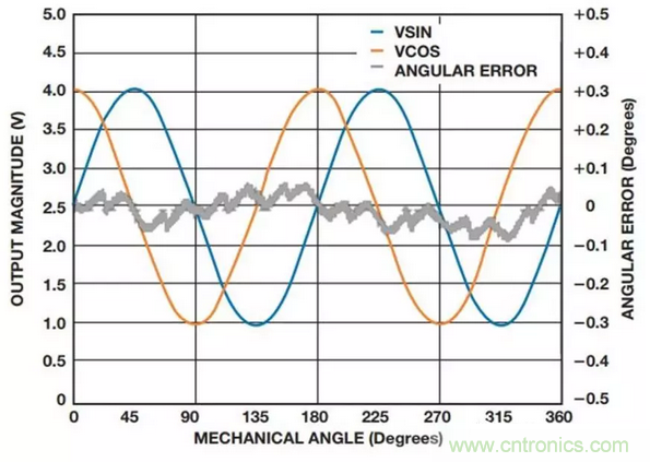 以Analog Devices公司的ADA4571 系列為例,圖2顯示了旋轉(zhuǎn)磁場(chǎng)施加在360° 機(jī)械旋轉(zhuǎn)情形時(shí)ADA4571的典型高輸出電平和角度誤差。經(jīng)微控制器進(jìn)行偏移校正后,典型誤差小于0.1°。