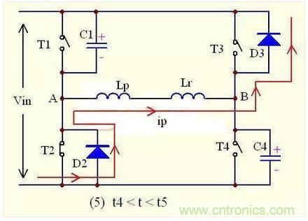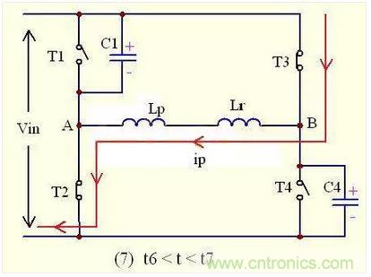 在t5-t6的時(shí)間內(nèi),副邊的二極管D1,D2還是同時(shí)導(dǎo)通流過(guò)電流,將副邊繞組短路,阻斷輸出電感反射到初級(jí)的途徑,此時(shí)的負(fù)載電流還是由次級(jí)電感與輸出電容提供;同時(shí),由于原邊的T2,T3已經(jīng)導(dǎo)通,原邊電流ip流過(guò)T3--Lr--T2,又因?yàn)長(zhǎng)r很小,所以原邊電流ip就會(huì)反向急劇增大。