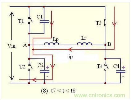 開(kāi)關(guān)模態(tài)八:負(fù)半周期超前臂諧振過(guò)程