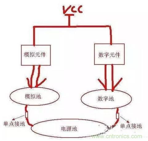 從這個圖可以看出:模擬地和數(shù)字地是完全分開的,最后都單點接到了電源地,這樣可以防止地信號的相互串擾而影響某些敏感元件,眾所周知數(shù)字元件對干擾的容忍度要強于模擬元件,而數(shù)字地上的噪聲一般比較大所以將它們的地分開就可以降低這種影響了。還有單點接地的位置應(yīng)該盡量靠近板子電源地的入口(起始位置),這樣利用電流總是按最短路徑流回的原理可將干擾降到最小。