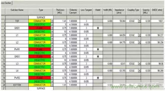 由上面的分析知道,PCB板的疊層設(shè)置和信號的耦合以及阻抗計(jì)算都有著密切的關(guān)系,所以在開始PCB設(shè)計(jì)之前必須進(jìn)行疊層設(shè)計(jì),然后進(jìn)行信號的阻抗計(jì)算。在本設(shè)計(jì)中的疊層設(shè)計(jì)見下圖: