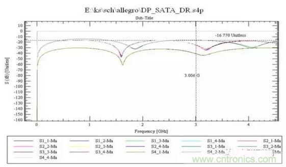 以上的相關(guān)步驟設(shè)置好以后就可以進(jìn)行仿真了,allegro可以進(jìn)行信號的反射仿真、串?dāng)_仿真,差分線還要進(jìn)行眼圖分析。當(dāng)然仿真也分前仿真和后仿真,在利用allegro進(jìn)行PCB設(shè)計(jì)的時候還需要結(jié)合仿真的結(jié)果實(shí)時的對設(shè)計(jì)進(jìn)行修改以達(dá)到符合要求的目的。由于仿真過程復(fù)雜,步驟繁瑣,在此不一一進(jìn)行描述, 差分對的布線有兩點(diǎn)要注意,一是兩條線的長度要盡量一樣長,等長是為了保證兩個差分信號時刻保持相反極性,減少共模分量。另一是兩線的間距(此間距由差分阻抗決定)要一直保持不變,也就是要保持平行。平行的方式有兩種,一為兩條線走在同一走線層(side-by-side),一為兩條線走在上下相鄰兩層(over-under)。一般以前者side-by-side 實(shí)現(xiàn)的方式較多。等距則主要是為了保證兩者差分阻抗一致,減少反射。對差分對的布線方式應(yīng)該要適當(dāng)?shù)目拷移叫?。所謂適當(dāng)?shù)目拷且驗(yàn)檫@間距會影響到差分阻抗(differential impedance)的值, 此值是設(shè)計(jì)差分對的重要參數(shù)。需要平行也是因?yàn)橐3植罘肿杩沟囊恢滦?。若兩線忽遠(yuǎn)忽近, 差分阻抗就會不一致, 就會影響信號完整性(signal integrity)及時間延遲(timing delay)。從仿真的S參數(shù)曲線圖可以分析差分對的差分阻抗(differential impedance),以及信號完整性。下面給出本設(shè)計(jì)中的關(guān)鍵信號仿真波形以供加以說明。 從仿真圖例圖5看到,S11在0-3.0GHz 的頻域范圍內(nèi)其最劣化的指標(biāo)為:-16.770db以下 ,S22(粉紅色的曲線)也不劣于-17db。 這說明該差分對的差分阻抗(differential impedance)接近設(shè)計(jì)指標(biāo),信號完整性得到了保證。