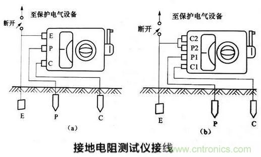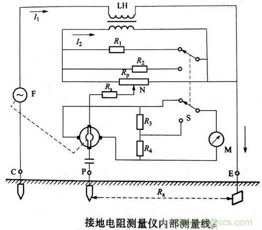 其中E為被測接地極,兩個輔助電極插人土壤的深度約為0.5m,第輔助電極P (電位