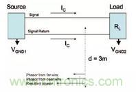圖1:電路回路中的共模電流。電路中的源是一個(gè)數(shù)字信號(hào)(帶諧波),其負(fù)載被假定為阻性。因?yàn)檫h(yuǎn)端導(dǎo)線上的相電流和近端導(dǎo)線上的相電流的流向是相同的,所以其合成相量相較于差模電流產(chǎn)生的相量會(huì)更大。在這種情況下,為了限制輻射發(fā)射的水平,降低諧波成分的大?。p慢數(shù)字信號(hào)的上升/下降時(shí)間)或者轉(zhuǎn)移/限制共模電流是非常重要的。