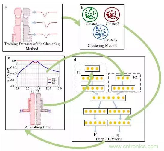 圖1:RINN架構。a, 聚類算法的數據集,即網格模型的S參數變化矩陣。B,聚類算法。C、網格化的模型和S參數矩陣訓練深度強化學習模型。d,以c為輸入,以動作的概率向量π和價值標量v為輸出的深度強化學習模型。