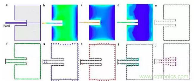 圖4:天線的聚類可視化結果。a,天線模型。b,表面電流密度分布。c,磁場分布。d,電場分布。e,Meshed模型。f-j,網格頂點聚類的可視化結果。