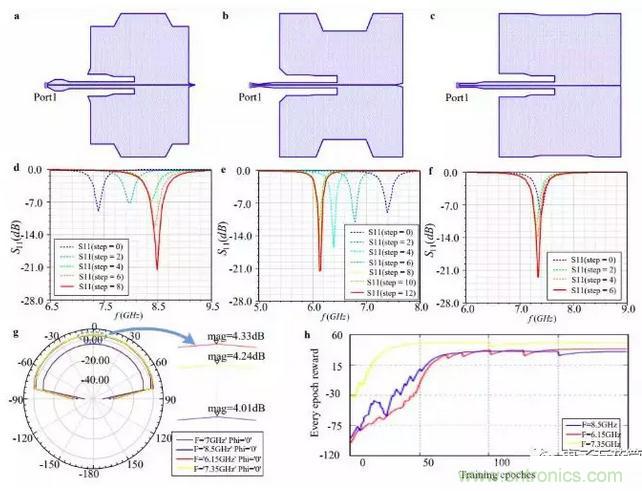 圖5:a-c)三種天線模型,其中心頻率分別為8.5GHz、6.15GHz 和7.35GHz,由智能體設計。d-f)觀察智能體根據回波損耗曲線(S11)的變化設計天線的過程。g)所有天線的增益模式。h)三種天線模型的學習曲線。