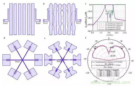 圖6:AI與人類專業(yè)工程師設計對比。a)由工程師設計的濾波器模型。b)由AI設計的濾波器模型。c)a 的回波損耗曲線(S11)和插入損耗曲線(S21),以及b 的回波損耗曲線(S11)和插入損耗曲線(S21)。d)由工程師設計的貼片天線模型。e)由AI設計的貼片天線模型。f)a 和b 的7.35 GHz 增益曲線。