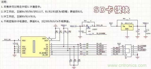 6、SD卡模塊電路(帶鎖)本電路與SD卡的封裝有關(guān),注意與封裝對應。此電路可以通過端口控制SD卡的電源,比較完善,可以用于5V和3.3V。但是要注意,有些器件的使用,5V和3.3是不一樣的。