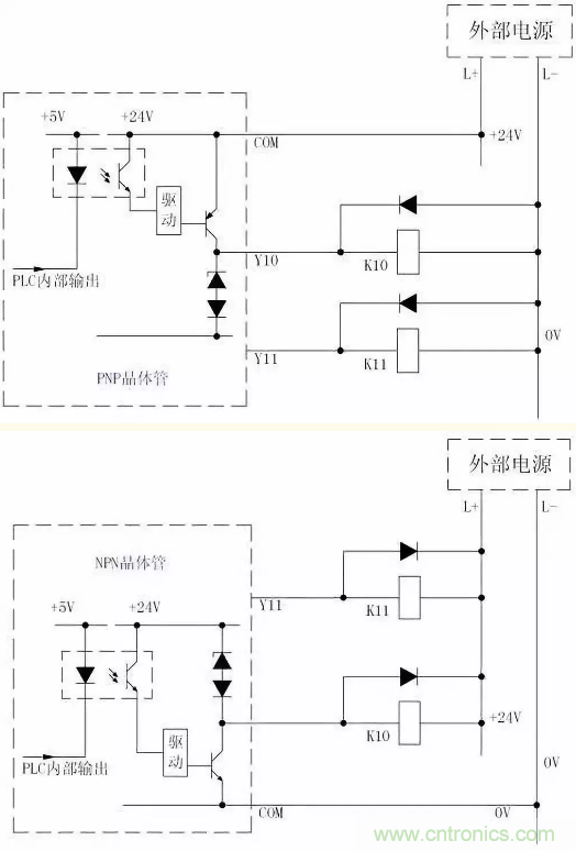 晶體管輸出型電路的外接電源只能是直接電源,這是其應(yīng)用局限的一方面。另外,晶體管輸出驅(qū)動能力要小于繼電器輸出,允許負(fù)載電壓一般為DC5V~30V,允許負(fù)載電流為0.2A~0.5A。這兩點(diǎn)的使用晶體管輸出電路形式時要注意。