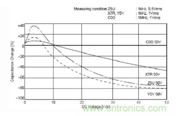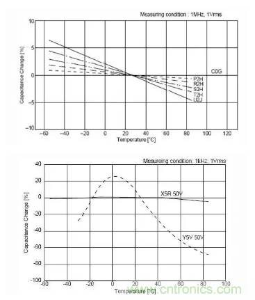 下面我們看一下C0G、X5R、Y5V三種材質電容受環(huán)境溫度和直流工作電壓的影響。