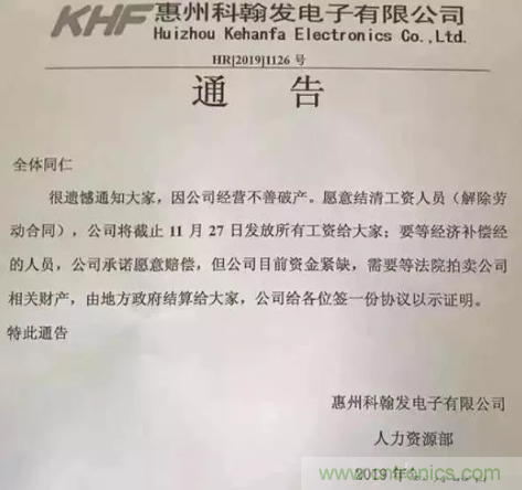 不僅僅是韓國(guó)LG因銷量下滑關(guān)閉PCB業(yè)務(wù),就在前幾日,PCB廠商惠州科翰發(fā)電子發(fā)出破產(chǎn)公告。公告稱,由于公司經(jīng)營(yíng)不善導(dǎo)致破產(chǎn),和員工解除勞動(dòng)合同并結(jié)清工資,將于11月27日發(fā)放薪資給大家,通告中特別說明公司愿意賠償給需要經(jīng)濟(jì)補(bǔ)償金的人員,只是由于公司資金緊缺,公司會(huì)和員工簽一份證明協(xié)議,待法院拍賣公司財(cái)產(chǎn)后由地方政府結(jié)算,也算是給員工一個(gè)交代。