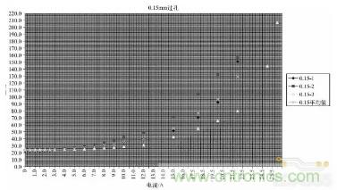 圖2 0.15mm孔徑的VIA溫升與電流的趨勢(shì)圖