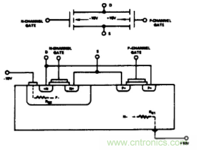 圖1是一個典型CMOS輸出開關(guān)單元的電路圖及截面圖。從不同單元和區(qū)域之間的連接關(guān)系中,我們可以畫出一個等效二極管電路圖(圖2)。如果在S端或D端的模擬輸人電壓超過電源電壓。