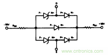 圖4舉例說明了通過在電源供電引腳串聯(lián)二極管(比如1N459)防止寄生晶體管導(dǎo)通的方法。如果S端或D端電壓高于電源電壓時,CR1和/或CR2反向偏置,基極驅(qū)動電路不能使晶體管導(dǎo)通。每個CMOS器件都應(yīng)該有一對獨立的二極管對其進(jìn)行保護。盡管這個方法很有效,但它不是萬無一失的。如果開關(guān)的一端連接到一個負(fù)電位(例如一個充電電容),并且另一端電壓超過VDD,則盡管有保護二極管。