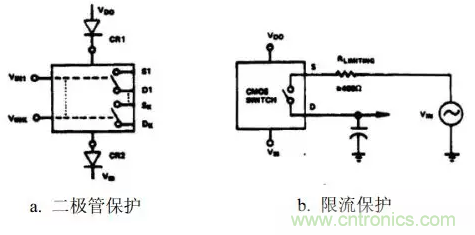 過壓能引起過大的電流和金屬化問題。通常,運算放大器的輸出作為S端或D端的電壓源,因此電流不能大于運算放大器直流輸出電流的限值。然而,瞬態(tài)感應(yīng)電流仍有可能破壞CMOS器件;因此,有必要進(jìn)行保護。