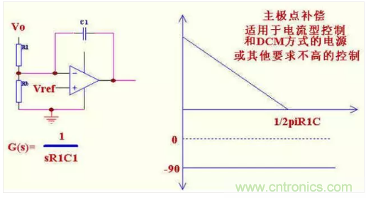 二: 單極點補償,適用于電流型控制和工作在DCM 方式并且濾波電容的ESR 零點頻率較低的電源.其主要作用原理是把控制帶寬拉低,在功率部分或加有其他補償?shù)牟糠值南辔贿_到180 度以前使其增益降到0dB. 也叫主極點補償.