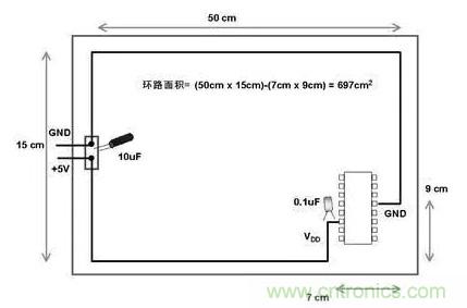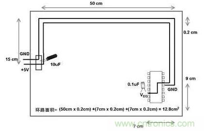 電源線和地線配合不當?shù)腜CB設計示例如圖2所示,此電路板上,設計出的環(huán)路面積為697cm²。采用圖3所示的方法,電路板上或電路板外的輻射噪聲在環(huán)路中感應電壓的可能性可大為降低。