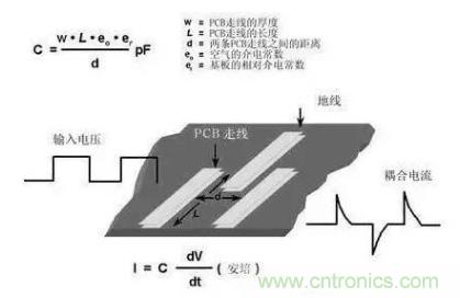 圖5在PCB上布兩條靠近的走線,很容易形成寄生電容。由于這種電容的存在,在一條走線上的快速電壓變化,可在另一條走線上產(chǎn)生電流信號。