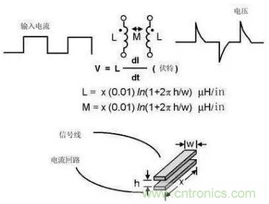 流經(jīng)電路板走線的開關(guān)電流將引起電壓發(fā)生變化,電路板走線存在寄生電感,可采用如下公式計算電壓的變化:V = LdI/dt。其中:V = 電壓的變化,L = 電路板走線感抗,dI = 流經(jīng)走線的電流變化,dt =電流變化的時間。