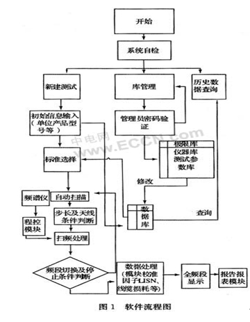 b.軟件構(gòu)成及功能:本軟件功能采用模塊化方法實現(xiàn)主要由界面參數(shù)輸入及數(shù)據(jù)顯示模塊、數(shù)據(jù)庫管理模塊、程控及自檢模塊、報告報表模塊組成。本EMI標準自動測試軟件具備以下功能:①參數(shù)設(shè)置,包括測試標準的選擇,測試配置的提示,測試參數(shù)的設(shè)置,如測試頻段、測量帶寬、檢波方式、掃頻步進量、參考電平、分辨率帶寬、掃頻方式、傳感器系數(shù)、電纜損耗、衰減/放大器等;②控制儀器(頻譜分析儀)以一定的步長和速率對信號進行掃頻測量、判別和讀出數(shù)據(jù);③數(shù)據(jù)處理能力.電磁輻射自動測量軟件能夠自動將測量的信號電壓轉(zhuǎn)換成干擾的量值,即自動補償因傳感器的使用而引起的隨頻率變化的校準系數(shù),并可用線性或?qū)?shù)頻率坐標顯示出信號的頻率分布,同時自動與相應(yīng)極限值進行比較,判別信號是否超標并在圖中表示出信號頻譜與極限值的關(guān)系;④數(shù)據(jù)的存儲和輸出能力,軟件可以將每次的測量數(shù)據(jù)以數(shù)據(jù)庫文件的形式進行保存,需要時提取,特別是傳感器系數(shù)和測試極限值都以數(shù)據(jù)文件的形式保存,便于數(shù)據(jù)處理和查詢時調(diào)用。⑤數(shù)據(jù)庫管理功能。主要對各標準的極限值,天線校準因子等進行數(shù)據(jù)管理。系統(tǒng)工作流程圖如圖1所示。