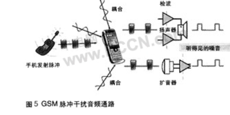 當(dāng)手機(jī)與基站通訊,或兩個(gè)手機(jī)彼此接近時(shí),發(fā)射脈沖通過擴(kuò)音器,揚(yáng)聲器,或頭戴式耳機(jī)線傳人音頻通路。見圖5。