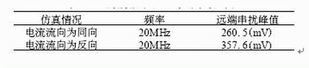 由仿真結(jié)果可知,電流流向為反向時的遠端串擾峰值(357.6mm)要大于電流流向為同向時的遠端口串擾峰值(260.5)。同時由圖4可以看到,當干擾源的電流流向改變后,被干擾源的串擾極性也改變了。這說明串擾的大小和極性與相應(yīng)干擾源上信號的電流流向有關(guān)的。