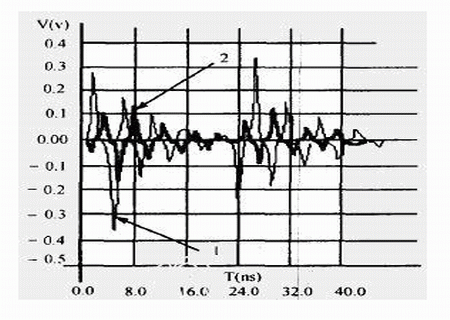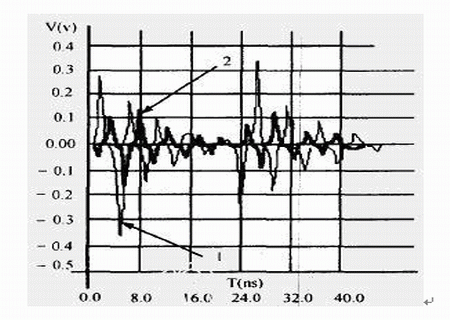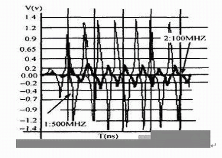 干擾源信號頻率越高,被干擾對象上的串擾幅值越大,我們對圖1中干擾源網(wǎng)絡(luò)AB上的信號頻率f1分別取不同頻率值時,對被干擾對象上的串擾進行了仿真,仿真結(jié)果見表2,信號頻率不同時的串擾波形見圖5,標記為“1”、“2”箭頭所指的波形頻率分別為“500MHz”、“100MHz”。