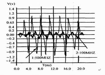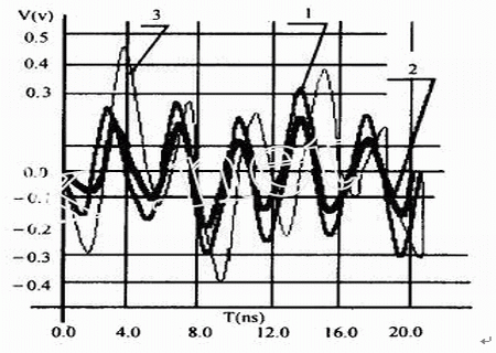 對于圖1所示的兩線系統(tǒng),我們進行了三種情況的仿真(線網(wǎng)AB上的信號頻率均為100MHz)仿真結(jié)果見表3,及圖6.:第一種情況是在兩線間距和平行長度不變的條件下,探測被干擾對象的串擾(標記“1”);第二種情況是在兩線平行長度不變的前提下,將兩線間距增加到10mils,然后探測被干擾對象的串擾標記“2”;第三種情況是在兩線間距不變的條件下,將兩線的平行長度增加到2.6inches標記“3”,然后探測被干擾對象的串擾。由仿真結(jié)果可見,當兩線的間距拉大時(P由5mils變?yōu)?0mils),串擾明顯地減小了,而當兩線的平行長度加長時(L由1.3inches變?yōu)?.6inches),串擾顯著增大了。