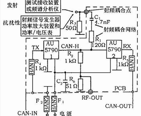 單線CAN通過單根總線連接,一般應(yīng)用于低速場合,典型傳輸速率33 kb/s,最多可連接32個(gè)節(jié)點(diǎn)。圖3所示的測試PCB上安裝了兩個(gè)單線CAN收發(fā)器AU 5790,電源線BAN2(包含電源濾波電感器)濾波器F1和F2給收發(fā)器提供工作電壓。收發(fā)器1接收經(jīng)BAN1(包含1 kΩ的串聯(lián)電阻)輸入的CAN信息,并經(jīng)CAN-H發(fā)送到收發(fā)器2,收發(fā)器2再將信息經(jīng)BAN1從測試板輸出。測試儀器通過射頻耦合網(wǎng)絡(luò)與CAN-H連接。