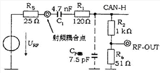 CAN-H的直流負(fù)載為R2和R6,電阻約為1 kΩ,射頻耦合網(wǎng)絡(luò)中的R1、C1和R3構(gòu)成CAN-H的交流負(fù)載,這些元件值的選取應(yīng)接近典型總線負(fù)載的值。其中R2和R6還構(gòu)成電阻分壓器,得到輔助的射頻輸出端(RF-OUT)。R6的選取應(yīng)使RF-OUT點(diǎn)的輸出阻抗為50 Ω,它與輸入阻抗50 Ω的測試儀器連接,衰減約為32 dB。設(shè)置輔助輸出端的目的:①測量從耦合節(jié)點(diǎn)到CAN-H線的傳遞函數(shù);②測量時(shí)域范圍內(nèi)CAN-H的電壓。