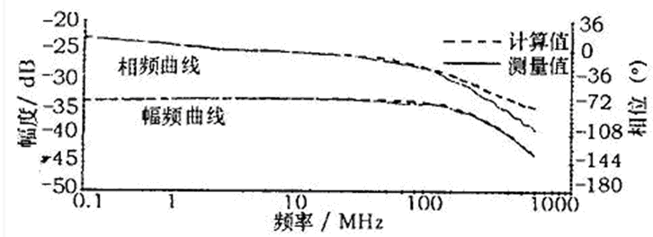 高頻范圍內(nèi)的轉(zhuǎn)折頻率由測試PCB決定,主要應(yīng)避免諧振的發(fā)生。為確定高頻轉(zhuǎn)折頻率,需要先測量或計(jì)算耦合網(wǎng)絡(luò)的傳遞函數(shù),Philips半導(dǎo)體實(shí)驗(yàn)室利用圖4所示的電路進(jìn)行了耦合網(wǎng)絡(luò)傳遞函數(shù)的測量和計(jì)算,圖4中CPCB為CAN-H到搭鐵的寄生電容,經(jīng)測量其值為7.5 pF,測量和計(jì)算的結(jié)果如圖5所示。將傳遞函數(shù)的計(jì)算結(jié)果與測量結(jié)果相比較,可以發(fā)現(xiàn)兩者非常吻合。并且由圖5可知,至少在500 MHz以內(nèi),測試電路不會(huì)受到諧振的影響。