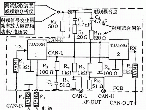 由于被測裝置將在汽車上使用,所以測試方法應(yīng)從現(xiàn)在的汽車EMC測試國際標(biāo)準(zhǔn)ISO 11451、CISPR25、ISO 11452中挑選。這些標(biāo)準(zhǔn)對(duì)應(yīng)不同的測試裝置和耦合方法,提供了一系列的測試方法。選擇EMC測試方法的依據(jù)是在有限設(shè)備的支持下,測試中以反復(fù)地進(jìn)行。為此,需要在被測電路和測試儀器之間提供一種已知的、易復(fù)現(xiàn)的耦合方式。對(duì)于評(píng)價(jià)收發(fā)器類型的集成電路,采用被測裝置和測試儀器之間直接耦合的方法即可達(dá)到上述要求。國際標(biāo)準(zhǔn)ISO 11452-7提供了直接耦合的測試方法,可用于元件級(jí)抗擾性的測試。