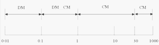 由于DC-DC轉(zhuǎn)換器的工作頻率基本都在幾百KHz,根據(jù)以往各型號產(chǎn)品的EMC檢測試驗經(jīng)驗,一般情況下DC-DC轉(zhuǎn)換器的EMI超標頻段都會覆蓋0.1_1MHz頻段的一部分或全部范圍。根據(jù)圖1所示的分布原理,我們通常要采取有重點地對CM和DM同時抑制的原則。