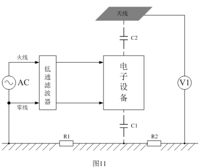 輻射干擾一般是通過(guò)電磁感應(yīng)的形式在空間進(jìn)行傳播的,圖11是測(cè)試電子設(shè)備產(chǎn)生輻射干擾的基本方法,或表示電子設(shè)備產(chǎn)生的干擾信號(hào)通過(guò)電磁感應(yīng)向空中輻射的原理。圖11中,電子設(shè)備表示干擾信號(hào)源,V1表示測(cè)量?jī)x表,C1表示電子設(shè)備對(duì)大地的電容,C2表示電子設(shè)備與天線偶合的電容,即:電子設(shè)備通過(guò)電場(chǎng)對(duì)天線產(chǎn)生感應(yīng),這里的天線也可以看成是被干擾的設(shè)備。圖11的測(cè)試方法就是測(cè)試電子設(shè)備周?chē)?guī)定距離某處的電磁場(chǎng)強(qiáng)度,由于干擾信號(hào)一般都是一個(gè)頻率成份非常豐富的非正弦波,因此,無(wú)法對(duì)它進(jìn)行直接測(cè)量,只能對(duì)它其中某一個(gè)頻率信號(hào)單獨(dú)進(jìn)行測(cè)量。