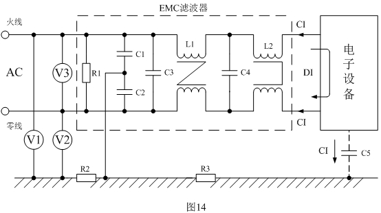 圖14是根據(jù)上面分析而設(shè)計(jì)的EMC(電磁兼容)濾波電路,EMC濾波電路如虛線框內(nèi)所示。