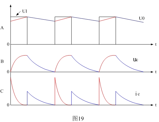 圖19是開關電源整流輸出電壓以及電源濾波電容的紋波電壓和紋波電流波形。圖19中紅線表示電容器充電時的電壓、電流變化曲線,藍線表示電容器放電時的電壓、電流變化曲線。其中Ui表示整流輸出電壓,Uo表示經(jīng)過濾波后的輸出電壓,uc表示濾波電容的紋波電壓,ic表示濾波電容的紋波電流。