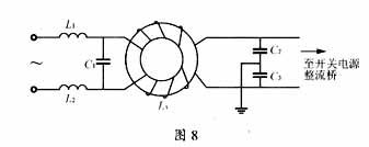 為更好抑制EMI對電路的一些改進(jìn)本電路中主要的EMI是電源噪聲對電網(wǎng)的干擾。可將原來的共模扼流圈L2與電容C10、C1組成的濾波電路,改善為如圖8所示電路,則L1、L2、C1可除去差模干擾,L3、C2、C3可除去共模干擾。L1、L2的磁芯為不易飽和的材質(zhì)。C1可選陶瓷電容,耐壓必須考慮輸入電壓的最大可能值,通常選用0.22~0.47μF。L3是共模扼流圈。選定C=C2=C3,截止頻率f0,則可根據(jù)計算L3;選定C1,截止頻率f0,可計算出L1、L2。