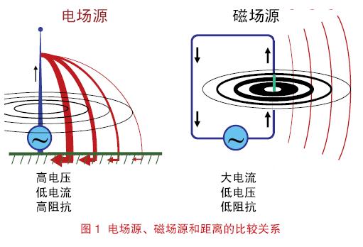 如果電荷作加速或減速運動或者電流增大或減小,就會產(chǎn)生變化的磁場。如此一來就會產(chǎn)生變化的電場,源就會輻射出電磁能量了。電磁能量既可以產(chǎn)生于高阻抗的電場源(高電壓-小電流)也可以產(chǎn)生于低阻抗的磁場源(大電流-低電壓)。如圖1 所示的單極天線和環(huán)天線就是這兩種源的典型代表。