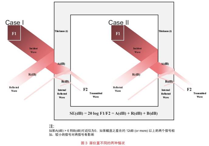在第一種情況下,源在殼體外部,整個屏蔽效能(單位為dB)可以近似歸納為