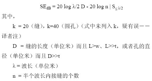雖然縫隙的形狀各異,但如果能夠?qū)⑵帘涡芤暈楹偷刃螤羁p隙天線的輻射效率相反的問題,就可以得到一個簡單的模型來計算最壞情況下縫隙的屏蔽效能。雖然這種假設(shè)也會導(dǎo)致一些錯誤,但對設(shè)計而言就足夠了,因為實際的屏蔽效能會高于計算給出的結(jié)果。最大開口尺寸為D 的單縫隙的屏蔽效能由下面等式的第一部分給出。等式的第二部分是對多個同樣尺寸縫隙情況的修正。