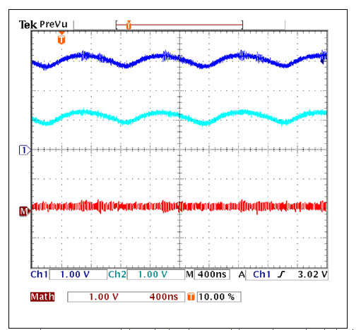 圖7.用MAX9704驅(qū)動(dòng)圖5a電路時(shí)FILT1和FILT2上產(chǎn)生的信號(hào)波形(同時(shí)顯示在頂部的跡線),以及差分輸出(底部的跡線)。