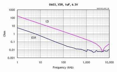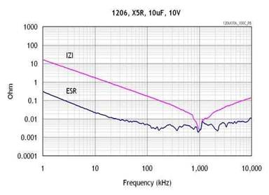 LDO需要增加外部輸入和輸出電容器。利用較低ESR的大電容器一般可以全面提高電源抑制比(PSRR)、噪聲以及瞬態(tài)性能。陶瓷電容器通常是首選,因為它們價格低而且故障模式是斷路,相比之下鉭電容器比較昂貴且其故障模式是短路。輸出電容器的等效串聯(lián)電阻(ESR)會影響其穩(wěn)定性,陶瓷電容器具有較低的ESR,大概為10mΩ量級采用陶瓷電容時,建議使用X5R和X7R電介質(zhì)材料,這是因為它們具有較好的溫度穩(wěn)定性。圖為X5R的ESR和頻率曲線。