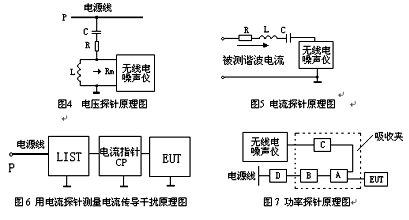 國(guó)際曾有人建議對(duì)小型電子設(shè)備采用類(lèi)似于CLSPRl4一l(對(duì)應(yīng)的我國(guó)國(guó)家標(biāo)準(zhǔn)是GB4343—l《家用和類(lèi)似用途電動(dòng)、電熱器具、電動(dòng)工具以及類(lèi)似電路的無(wú)線電干擾特性的測(cè)量方法和允許值》)中所提供的吸收鉗(或稱為功率探針、鐵氧體鉗)方法來(lái)測(cè)試EUT對(duì)外的輻射功率。利用吸收鉗可以測(cè)量5MHz—300MHz的傳導(dǎo)干擾功率。采用此法的前提是EUT尺寸較小,其輻射到空間的能量主要是通過(guò)EUT的電源線等逸出的。因此,對(duì)這部分能量的測(cè)量可以用一個(gè)環(huán)繞電源線的吸收裝置來(lái)實(shí)現(xiàn)。這個(gè)吸收裝置便被稱為吸收鉗。這個(gè)方法的優(yōu)點(diǎn)是簡(jiǎn)便易行,對(duì)環(huán)境要求不高,在屏蔽室里便可進(jìn)行,而且測(cè)試結(jié)果有很好的重復(fù)性和可比性。電壓、電流傳導(dǎo)干擾可分別由電壓探針和電流探針測(cè)出。圖4、圖5分別為電壓探針和電流探針原理圖。圖6為電流探針測(cè)量電流傳導(dǎo)干擾原理圖。功率探針原理見(jiàn)圖7。