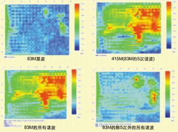 圖3的各個(gè)空間分布圖,是通過指定頻率點(diǎn)來看該頻率點(diǎn)的空間腹部圖。通過在圖中最上面的頻譜圖中用×指定頻率點(diǎn)后得到的。可以指定一個(gè)頻率點(diǎn)查看每個(gè)頻率點(diǎn)的空間分布,也可以指定多個(gè)頻率點(diǎn),例如指定83M的所有諧波點(diǎn),查看總的頻譜圖。