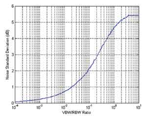 指定視頻濾波器關(guān)閉(或不小于3倍RBW)的目的,是為了消除視頻濾波器對檢測到的信號的影響。圖4是視頻帶寬(VBW)與RBW之比變化時視頻帶寬的影響。在VBW≥3*RBW或10*RBW(或失效)時,噪聲標(biāo)準(zhǔn)偏差保持在5.4dB.在VBW=RBW時,例如在TELEC規(guī)范部分章節(jié)中,噪聲變化降低到大約4.7dB.