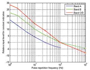 對于帶有QP檢波器的接收機上的常數(shù)指標(biāo),圖3表明了CISPR 16-1-1標(biāo)準(zhǔn)描述的幅度和重復(fù)頻率之間的關(guān)系。